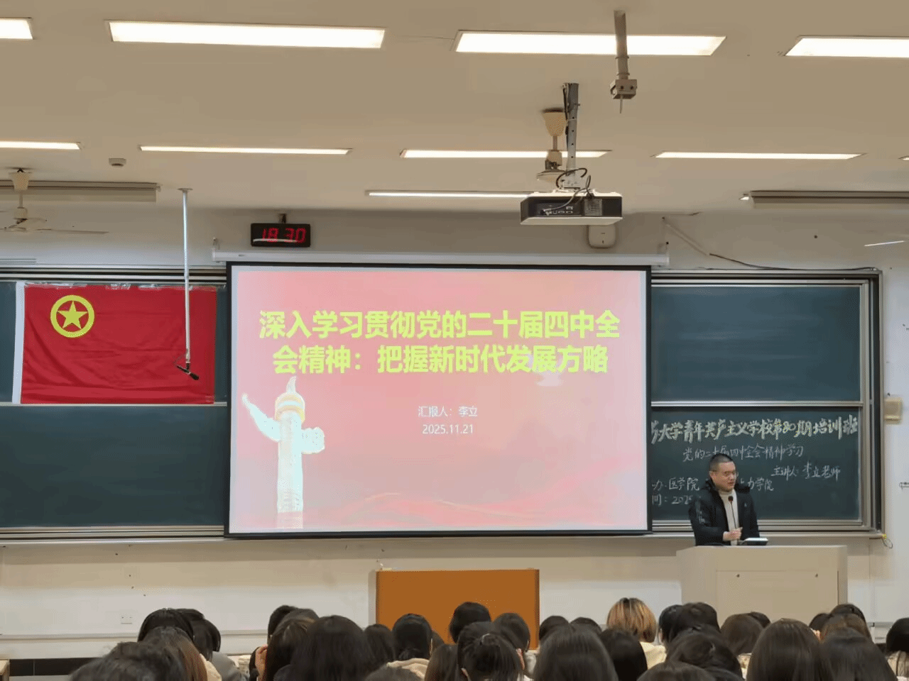 为引导团员青年深入领会党的二十届四中全会精神,筑牢思想根基、勇担时代使命,2025年11月21日下午18时30分,江苏大学文学院联合医学院、土力学院在讲堂群103举办了以“党的二十届四中全会精神学习”为主题的第80期团校培训班第一讲。本次团课由马克思主义学院李立老师主讲,文学院、医学院和土力学院的班团干部共同参加。