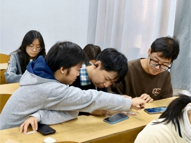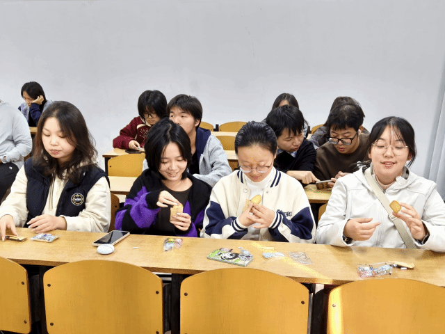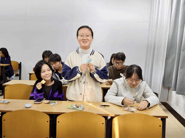 其次,“幸运小饼干”互动环节为班会注入了满满的惊喜与暖意。姜佳颖为32位同学每人准备了一个装满祝福的零食小袋子,同学们可以随心选取第一眼心动的那份。指尖的选择承载着冥冥中的缘分,拆开饼干的瞬间满是惊喜与期许。饼干中“喜结良缘”“平安喜乐”“财源广进”等真挚祝福跃然眼前,同学们纷纷互相分享期待与拆出饼干后的喜悦。在欢声笑语中,幸福的种子悄然萌发。