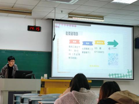 随后,谈润向大家展示了学校及学院定期举办的各类心理健康活动,如“5.25”心理健康教育月系列活动、心理健康讲座、团体心理辅导、心理沙龙等。这些形式多样、内容丰富的活动,为同学们提供了认识自我、舒缓压力、发展能力的广阔平台,激发了大家的参与兴趣。