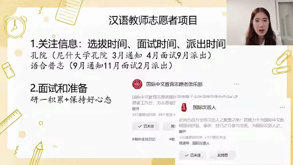 随后,韩妙阳通过远程连线的方式,在地球另一端与大家分享了申请孔子学院志愿者的经验。她强调研一时期需要锻炼学术研究、教学实践、语言与文化三个方面的能力,研二研三时期则要积极申请孔子学院志愿者或留校语言文化中心实习。各类实习申请的难度不一,她也鼓励大家多大胆尝试,希望国际中文教育的学子能在大洋彼岸发扬中华文化。参会青年认真听讲,并积极与学姐们交流互动,现场氛围热烈。