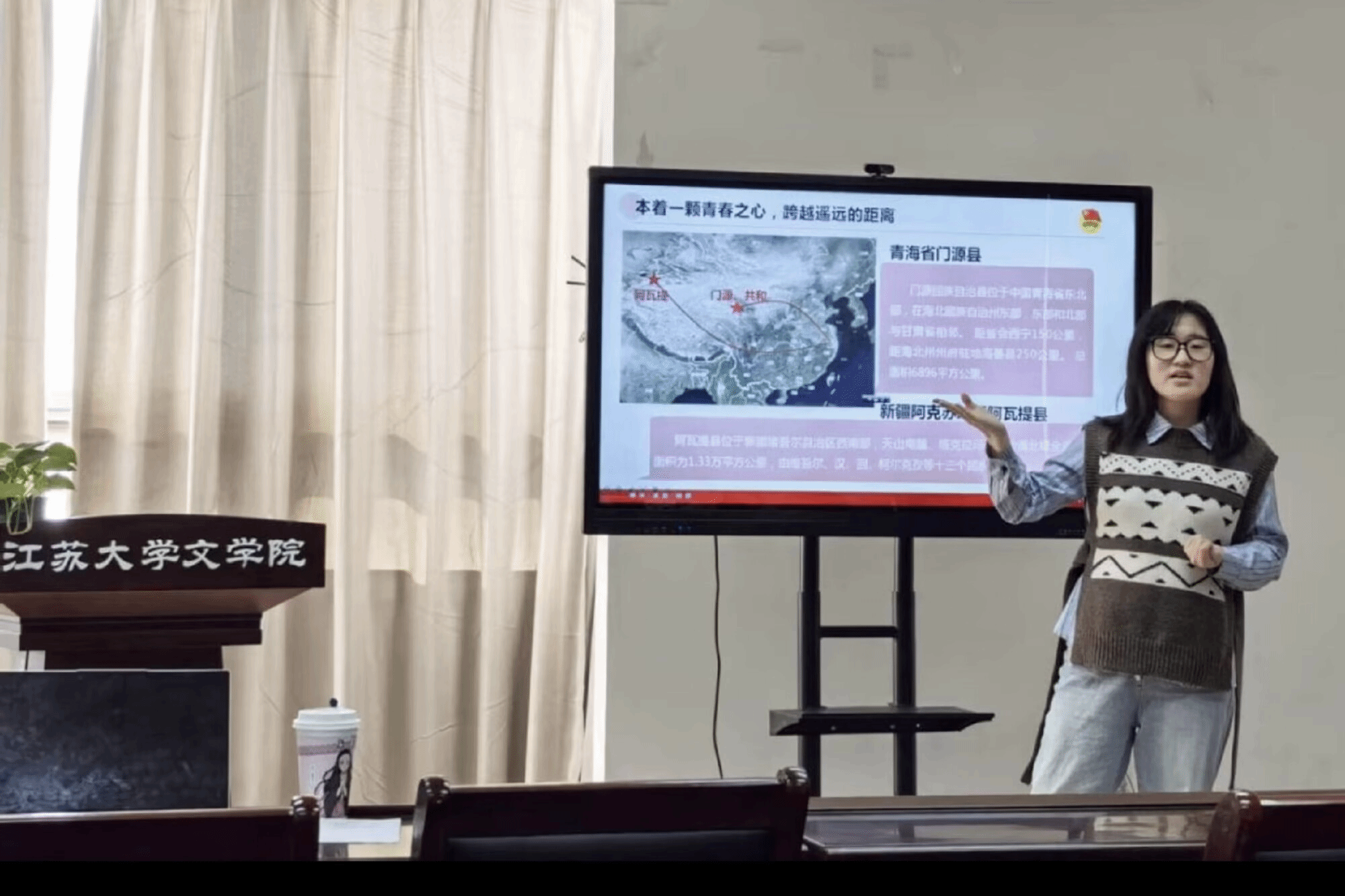 此次活动邀请到了江苏大学第26届研究生支教团青海分队队长庄楚渝、塞尔维亚尼什大学孔子学院汉语教师志愿者韩妙阳进行宣讲。活动伊始,主持人吴欣宇简要介绍了活动流程,并热烈欢迎两位优秀学姐的到来。接着,庄楚渝向支部青年们讲述了她在青海省海北藏族自治州门源回族自治县的门源县第二寄宿制初级中学的支教经历。她回忆起和藏族小朋友相处的美好时光,并强调支教给自己带来了思想和认知上的改变,希望支部青年们也能在支教中感受青春的力量和教育的意义。