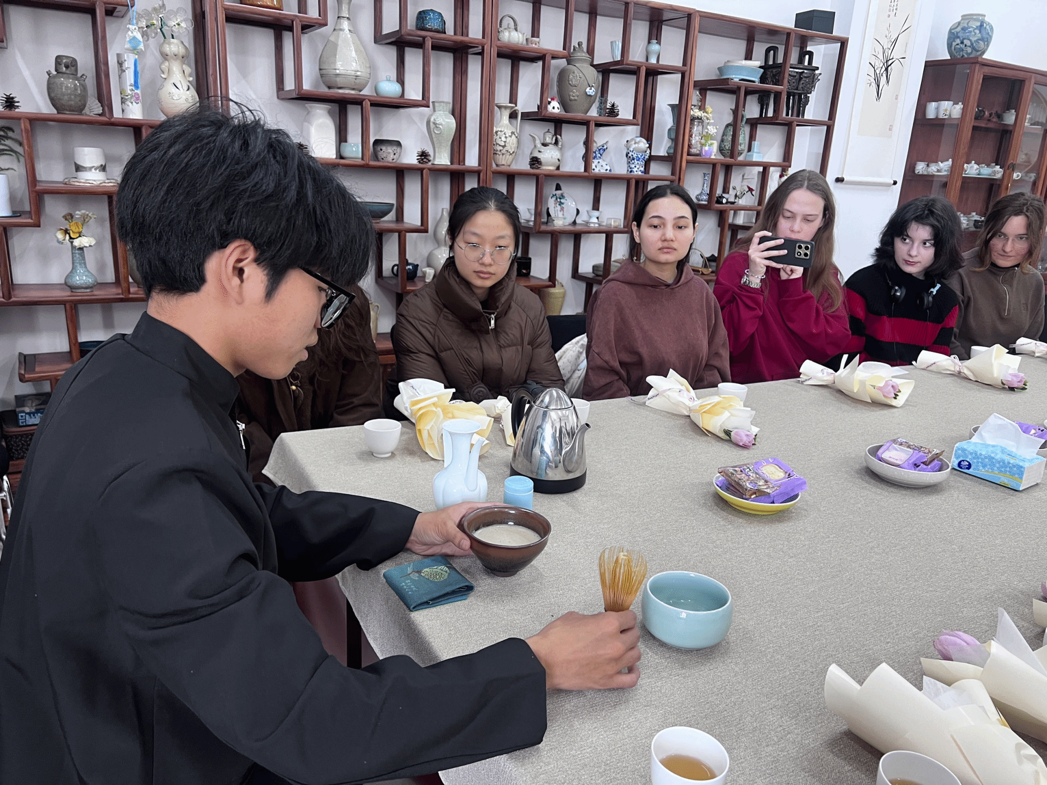 最后,茶艺社成员现场演示盖碗茶艺与宋代点茶技艺,动作优雅娴熟,尽显传统韵味,赢得阵阵掌声。在茶艺师的指导下,大家踊跃参与实践,在温杯、投茶、注水、出汤的一招一式中,体会茶道的宁静与优雅;以茶沫为纸、茶匙为笔,勾勒出精致的菊花图案,亲身领略宋代“茶百戏”的独特魅力。大家相互交流泡茶心得,分享生活中的点滴趣事,体悟“以茶修身、以茶养性”的真谛,感受到传统文化带来的心灵滋养。
